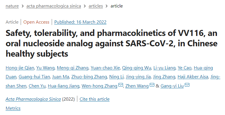 北京时间2022年3月16日,药学领域知名期刊Acta Pharmaceutica Sinica发表了口服核苷类抗SARS-CoV-2药物VV116的3项I期临床研究结果,复旦大学附属华山医院张文宏教授、中国科学院上海药物研究所王震研究员、上海市徐汇区中心医院刘罡一主任为共同通讯作者。研究结果显示,VV116在健康受试者中表现出令人满意的安全性和耐受性,且口服吸收迅速,可在空腹或普通饮食条件下口服用药,建议在后续临床研究中探索每日两次200毫克~600毫克给药剂量。这是国产口服小分子抗新冠病毒药物首次公布I期临床数据,为抗击疫情增添了信心。